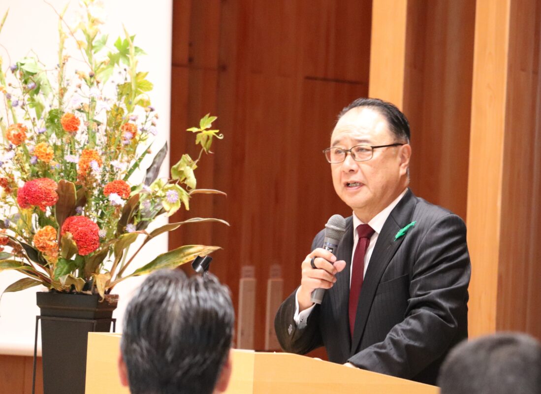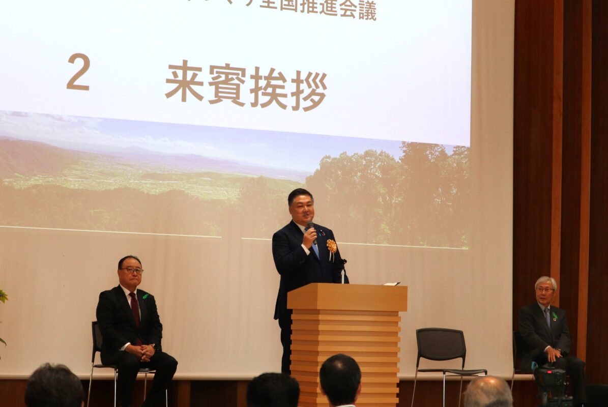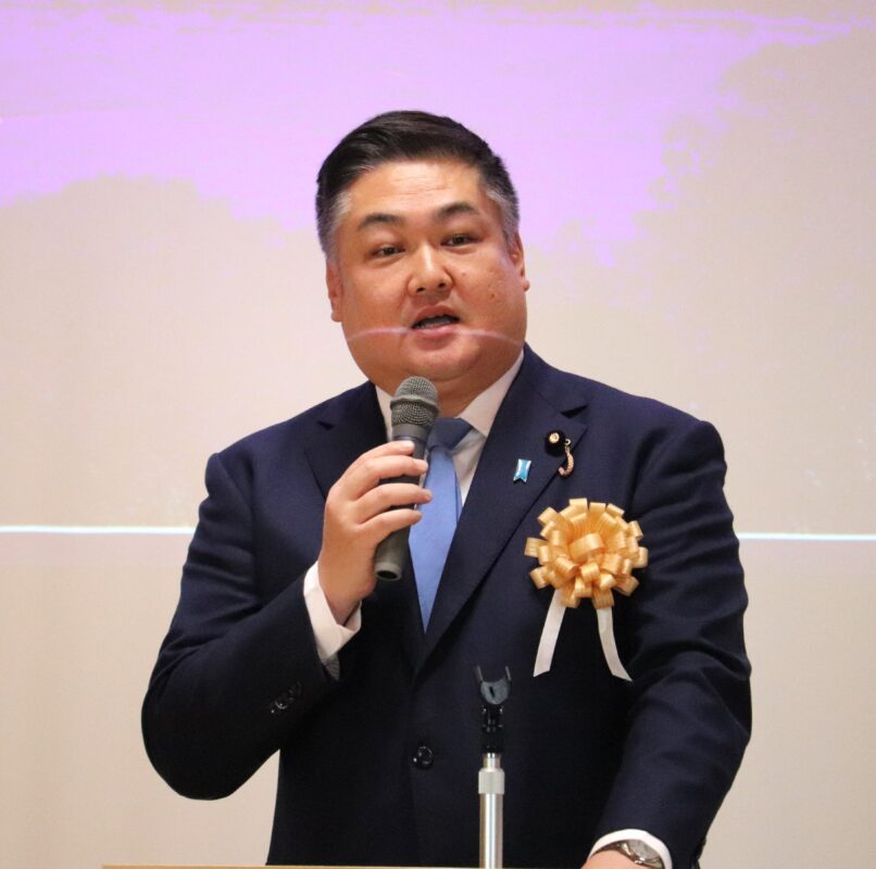 「農林水産副大臣を1年勤めさせていただきましたが、この間、省内に地方みらい共創研究会を立ち上げ、5月に、農林水産地域における地方創生の実現に向けた課題や方針を「地方みらい共創戦略」として取りまとめたところです。その中に「森業」を掲げました。企業による森づくり、森林由来Jクレジットの創出や活用、森林空間の利用など、森林の持つ多面的な機能に価値を見出し、地域に賑わいや雇用を創出する仕組み、これを「森業」と位置づけて政策的に推進する方針を明確に示したところです。皆様におかれましても、この戦略が掲げる森業の理念を御理解いただきまして、地域の魅力や活力を引き出す原動力として今後ますますご活躍されていくことを期待してございます。」