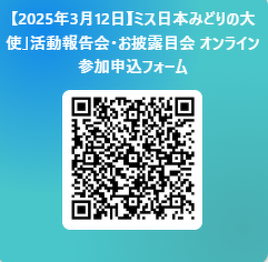 多くの皆さまが「ミス日本みどりの大使」の出演機会をご検討頂けるように、安藤 きらりさんから具体的な活動の事例報告を、また佐塚 こころさんのお披露目等を行う「活動報告会・お披露目会」を開催いたします。皆さまのご参加をお待ちしています。