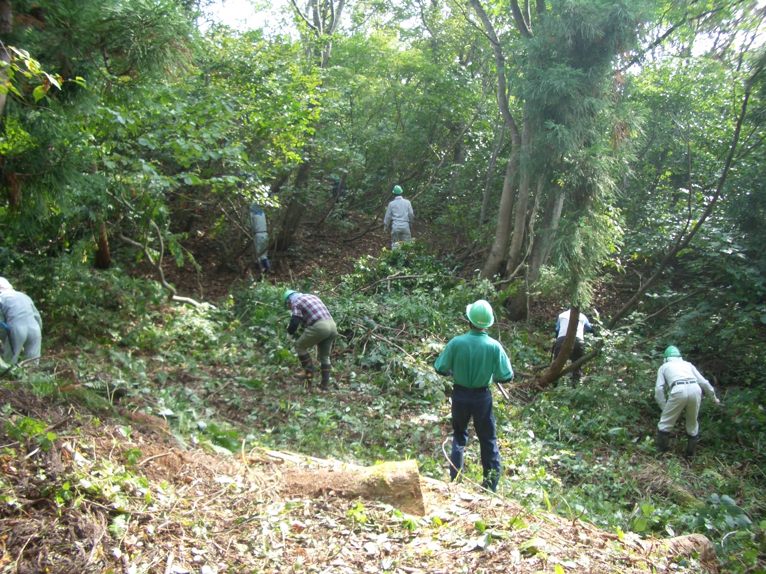 昭和46年ギフ蝶とヒメギフ蝶の混生地として国の天然記念物に指定された黒岩山は長野県飯山市の中西部に位置しています。頂上付近には桂池があり、モリアオガエルやクロサンショウウオも生息していますが、高齢化や過疎化で雑木、雑草が生い茂りギフ蝶・ヒメギフ蝶の食草ウスバサイシンやカンアオイが減少し、生態に影響が出ています。この企画では森林ボランティアによる自然環境保全や自然散策を行うことで森林との接点を見出し、都市と農山村との交流を促進し、地域への理解と支援を広めることを目的として、7年前から地元活動グループ「黒岩山保全協議会」の皆さんと”協働”で森林ボランティア活動を行っています。