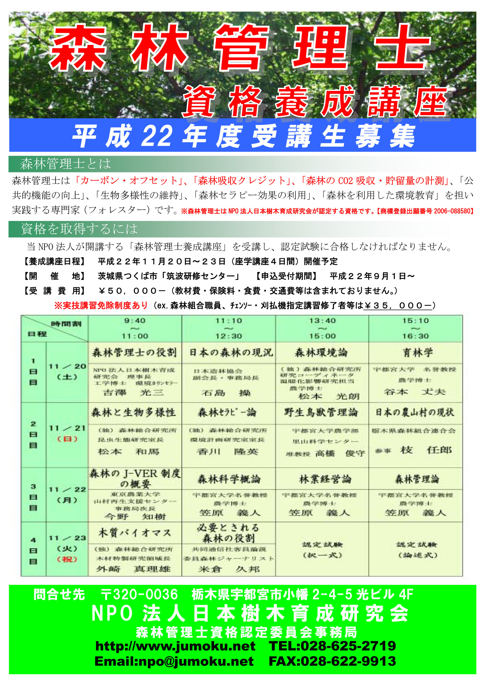 荒廃した森林を健全な森林に再生するため、森林ボランティアリーダーを養成する講座を開講します。本講座では、森林管理の知識・技能を習得するだけでなく、「カーボン・オフセット、「森林吸収クレジット」、「森林の二酸化炭素吸収貯留量の計測」、「森林の公共的機能の向上」、「生物の多様性の維持」、「森林セラピー効果の利用」、「森林を利用して環境教育」を担い、実践する専門家(フォレスター)を養成するための講座です。