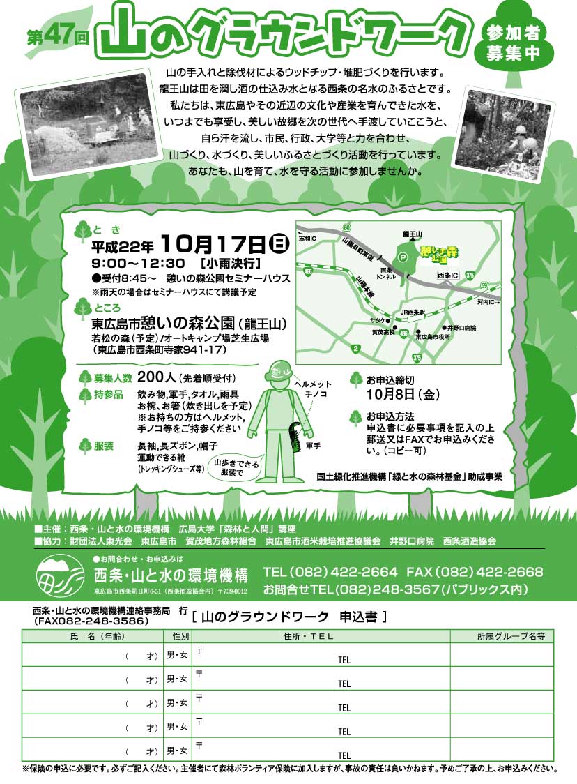 東広島市(酒どころ西条)の米づくり、酒づくりのいのちである水。その水源の山の一つ龍王山の森林の手入れを通じて、「山づくり、水づくり、美しいふるさとづくり」を市民・行政・企業・大学などが力を合わせておこなっています。