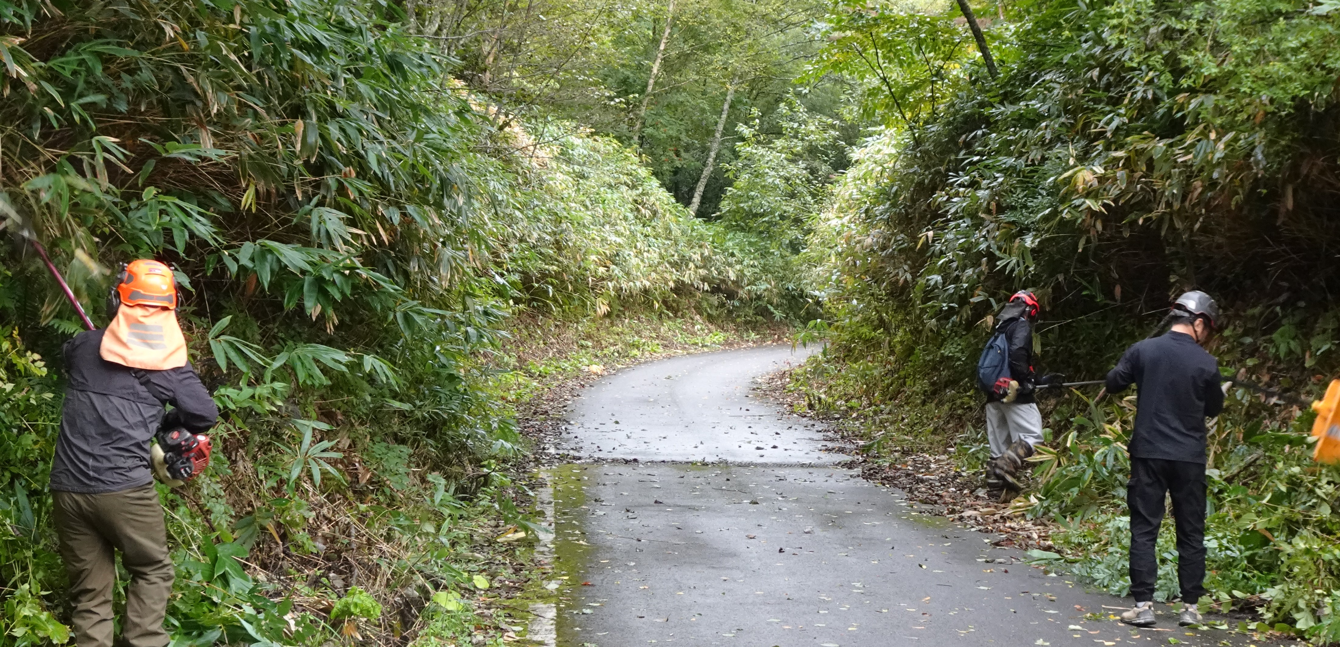 今年の下呂支部の活動は、9月29日に会員20名が参加し、同センター入口から、濁河原生林を回る「さわらだに林道コース」(椹谷林道)沿いで、ランニングや自然散策の支障となっている林道法面の笹や雑草の刈り払いや路面や側溝に堆積した落ち葉清掃など森林整備活動を行いました。